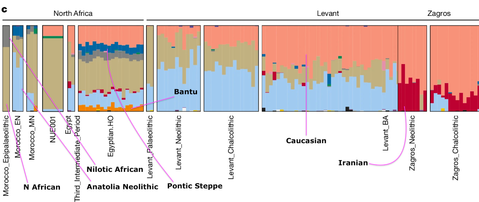 The PCA and admixture analyses indicate that NUE001 had parents with predominantly North African ancestry, and minority ties to West Asia, specifically the Caucasus and Iran. Interestingly, a shift occurred millennia later during the period of the New Kingdom; even before the Roman conquest, Egyptians seem to have seen an influx of particularly Levantine ancestry during the early to middle Bronze Age, long after the Nuwayrat man’s death. Finally, note how the modern Egyptian samples from the “Human Origins” (HO) dataset reveal continued predominance of the khaki-toned North African cluster, but at reduced levels compared to antiquity. Modern Egyptians have Sub-Saharan African ancestry, both Nilotic ancestry, with a presumably Nubian provenance, and Bantu-like heritage reflecting the wide reach of the Islamic slave trade. Pontic-steppe genetic influx is also present, likely from Mameluke slaves who were imported from among the Turkic peoples north of the Black Sea.
