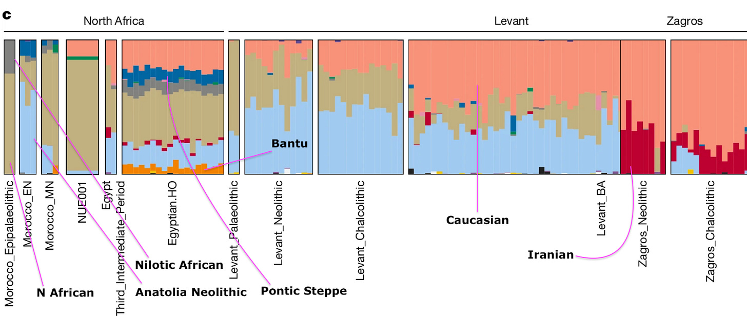 Ancient DNA allows us to examine exactly how continuous a people are with their forebears, but the way ancient Egyptians preserved their elites’ remains with chemical processes has left paleogenetics a relative dearth of material. Ironically, the very mummification that brings us so eerily close to the human faces of antiquity, guarantees their DNA’s destruction. Nevertheless, a 2017 paper reported genome-wide data on three ancient Egyptians, with the authors finding substantial continuity between ancient and modern Egyptians. After their conquest by Arab tribes Egyptians were subsequently Islamicized and Arabicized, but their genetic origins remained predominantly among the native peasantry. However, a major lacuna in this work is that the oldest whole genomes (as opposed to just mtDNA) date to the 8th century BC, after the New Kingdom’s fall, at the very end of dynastic Egypt proper. Though this was still the Egypt of the pharaohs, these last centuries of native rule marked a great civilization’s twilight, and outside influences, from Libya in the west, Nubia to the south, as well as the Levant and Iran, loomed large.