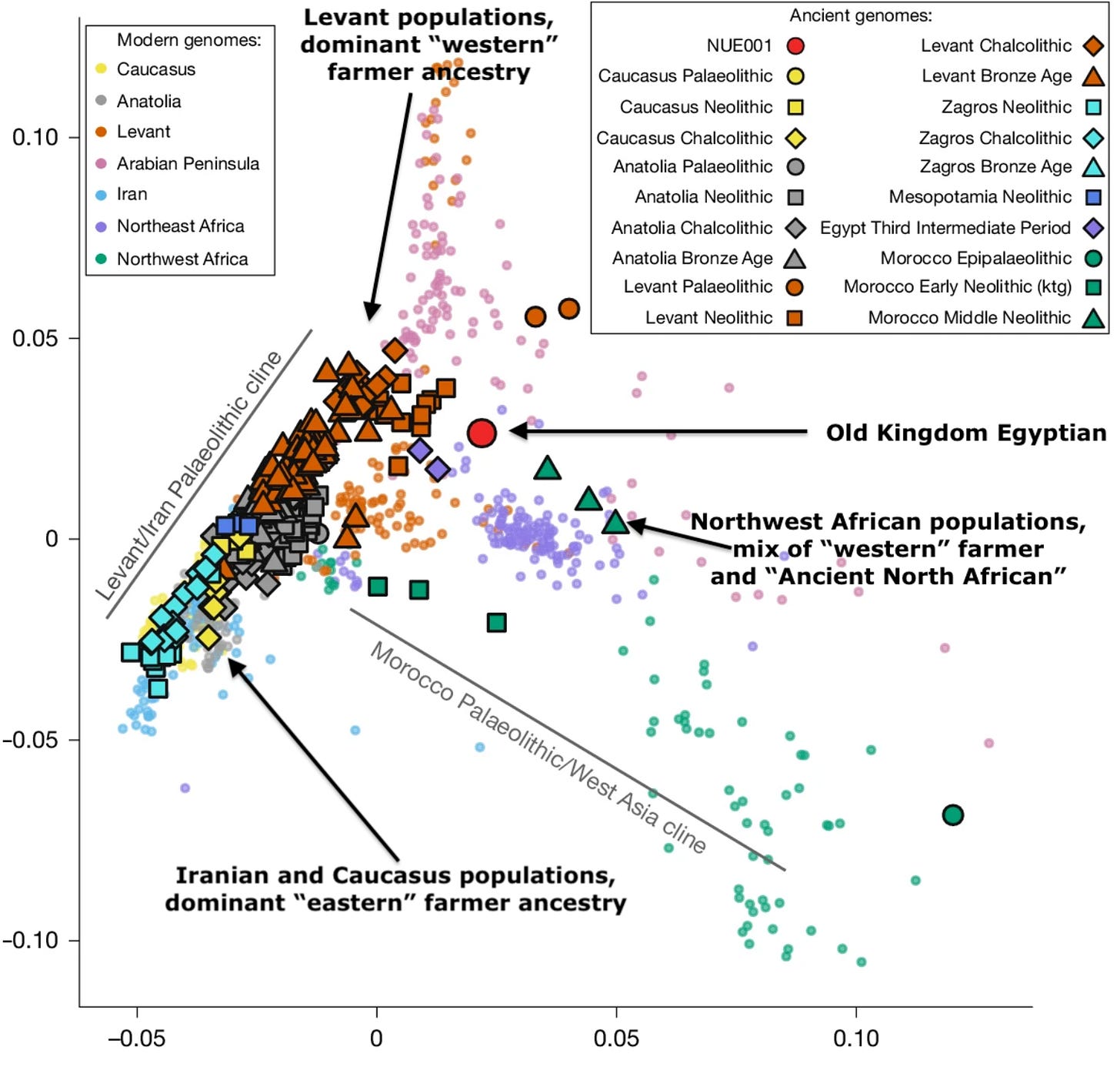 Now, a Nature paper reports the analysis of an entire genome from the Old Kingdom, approximately 1,850 years before those previous oldest genome-wide samples in our data. Going back to the very root and foundation of Egyptian civilization, this individual gives us a clear window onto Egypt’s genetic and demographic landscape at the very beginning of history.