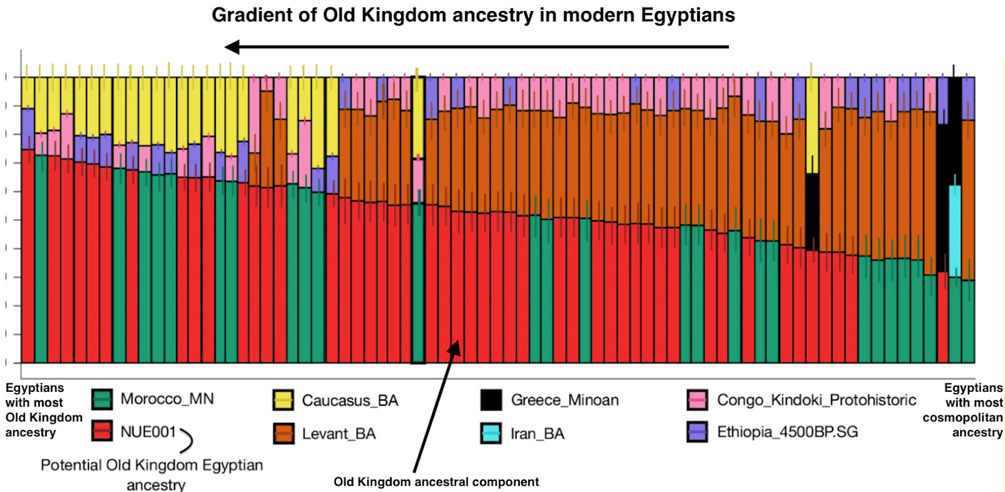 To get clarity on the proportion of Old Kingdom Egyptian ancestry remaining in modern Egyptians the authors used a more explicit and formal method that modeled NUE001 as a hypothetical donor population, along with a slate of other groups derived from ancient DNA samples (reading left to right, Morocco Middle Neolithic, Bronze Age Caucasus, Minoan Greece, early Bantu-era Congo, Nuwayrat man as NUE001, Bronze Age Levant, Bronze Age Iran and prehistoric Ethiopia). It is quite plausible that the Morocco Middle Neolithic component is simply ancient Egyptian ancestry being mis-categorized because Nuwayrat man was himself mostly North African. Assuming that the Moroccan Middle Neolithic is also tagging in ancient ancestry from the Old Kingdom, modern Egyptians average a bit more than half ancient Egyptian. Because Sub-Saharan African ancestry is so easily detected given its immense internal diversity and distinctiveness, we have already known for a couple of decades that about 10-15% of modern Egyptian ancestry derives from the Islamic-era slave trade. But that still leaves a substantial minority, which seems to be the product of gene flow out of West Asia probably occurring in waves between the Bronze Age, about 4,000 years ago, until after the Arab invasions of the 7th century AD. Finally, the number of individuals showing Caucasian ancestry tracks the southbound trade in military slaves that persisted for 500 years along routes through the Black Sea. Between AD 1300 and 1800, Egypt’s ruling elite were Mamelukes, who were usually ethnically Turkic or Circassian (and remain overrepresented among the nation’s ruling class, though they are now fully Arabized).
