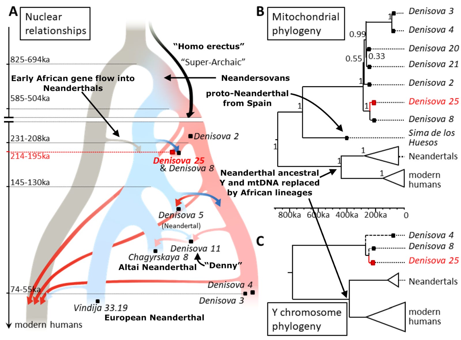 Though Denisova 3 and Denisova 25 are the only two high-quality genomes from the caverns recovered thus far, Denisova 2, 4, 8 and 11 each yielded enough material for simple phylogenetic analyses. Comparing numbers of shared and unshared genetic variants across the genomes, Denisova 8 and Denisova 25 are particularly genetically close, unsurprising since their positions within the sedimentary layers excavated date them to similar periods. Denisova 4 and 11 are noticeably more similar to Denisova 3 than to Denisova 8; again, no big surprise when you consider the times when their position suggests they lived. The newly discovered Denisovan genome is genetically closer to Neanderthal sequences than the 65,000-year-old Denisova 3 is, reflecting that the former bears more Neanderthal ancestry. Unlike the other samples mentioned here, Denisova 5 is a Neanderthal, and not a Denisovan human. Additionally, the new Denisova 25 individual’s genes are more similar to the Denisova 5 Neanderthal’s than to all other sequenced Neanderthals. Because this Neanderthal dates to about 60,000 years after Denisova 25 lived, the most likely explanation is that the ancestors of the Neanderthal labeled Denisova 5 had absorbed Denisovan ancestry specifically from a population related to Denisova 25.