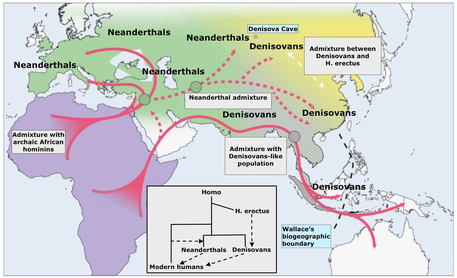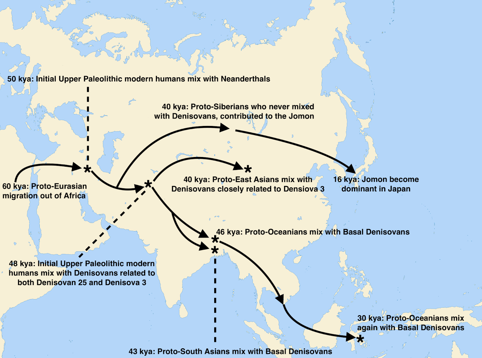 So this single genome from a woman interred in Denisova Cave brought the revelation that over 500,000 years ago a group of humans left Africa to spread out across Eurasia, trekking north and east, becoming Neanderthals and Denisovans respectively. With the abstruse arts of statistical genomics, researchers have since also inferred from that single genome that multiple admixture events with separate Denisovan lineages contributed trace ancestry to modern populations, from the Siberian Denisovans responsible for an average 0.15% of ancestry in East Asians today, to the southern Denisovans who contributed 4% of modern Papuan ancestry.